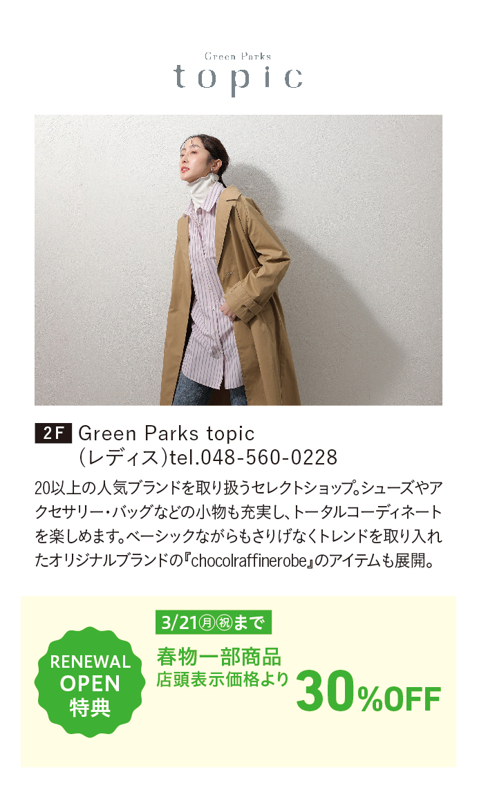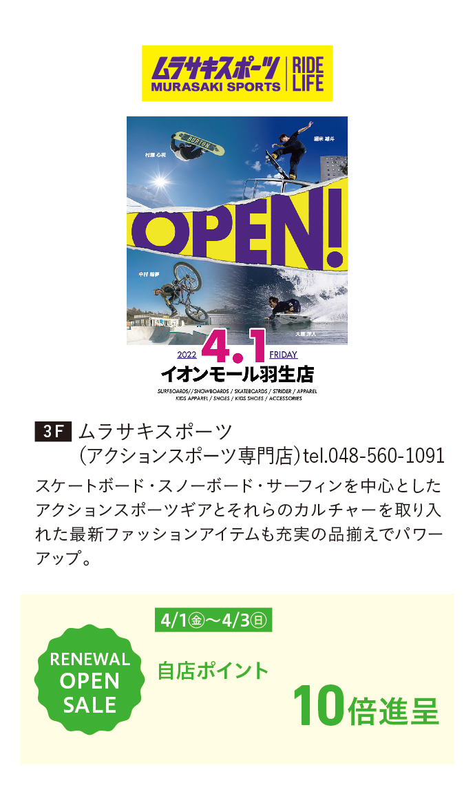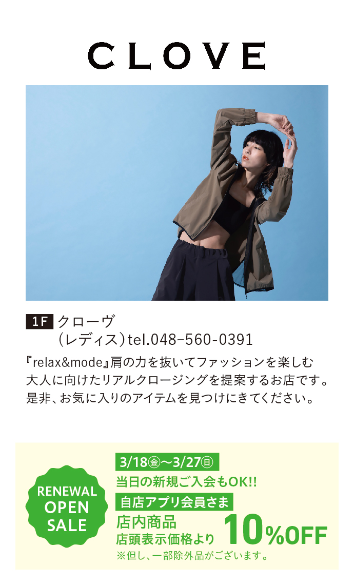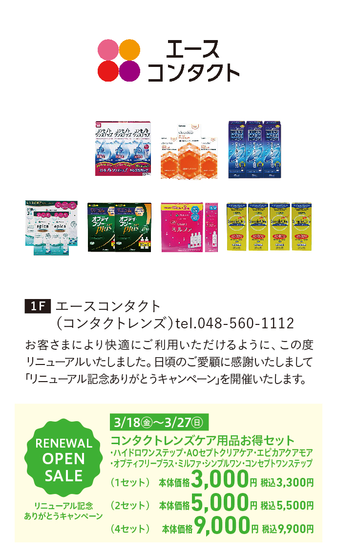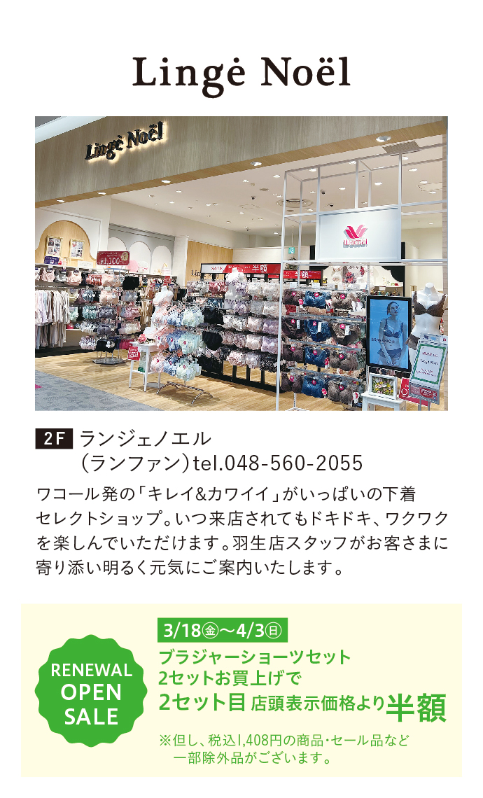 リニューアルのお店1 クローヴ グリーンパークストピック 常磐珈琲 セレクトコスメショップ エスポワール リニューアルのお店2 & chouette 無尽蔵 きものやまと エースコンタクト リニューアルのお店3 ムラサキスポーツ サーティワンアイスクリーム 金犬くん ランジェノエル リニューアルのお店4 がってん承知の助 チャイハネ more coming soon 注釈 NEWSHOPへ 3.18リニューアル TOPへ イオンモール羽生ホームページへ